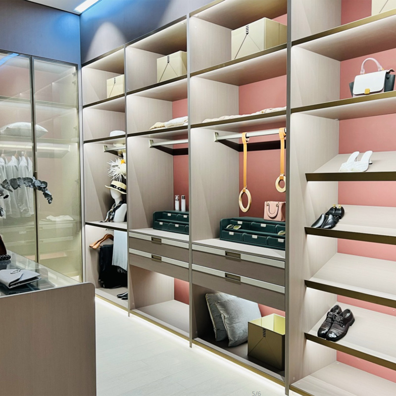 Denna walk-in-room garderob designad med melamin carcave, visuell effekt är lyxig och livlig, lämplig för unga framgångsrika människor, applikation för villor, radhus projekt.