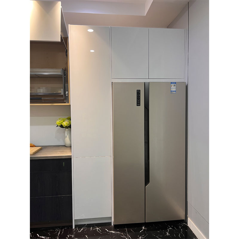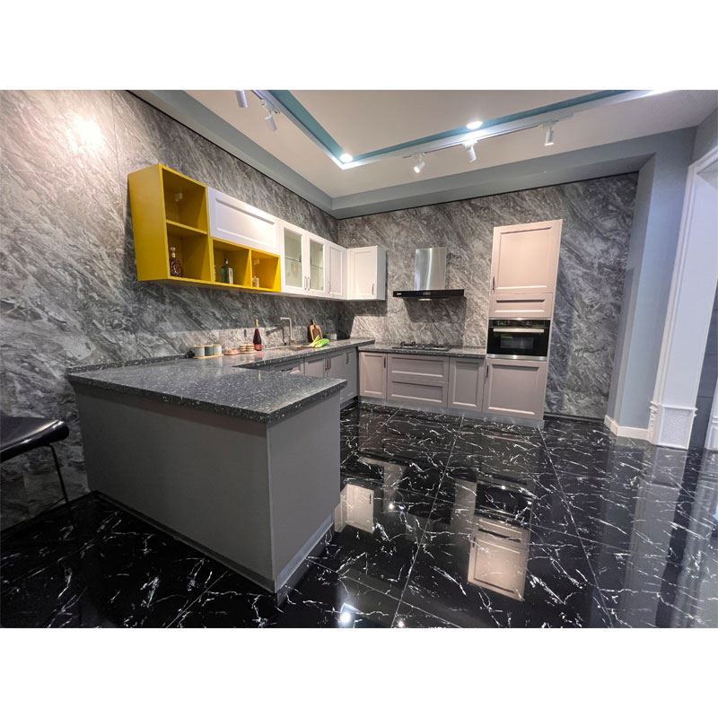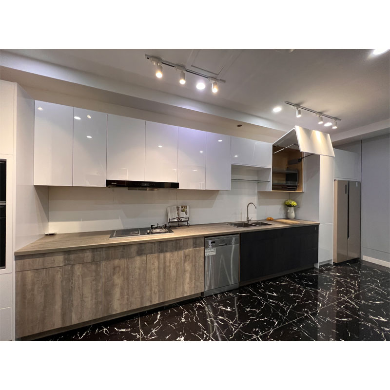 Grå och vit färgkombinationstyp är mer och mer populär. Dörrpanelens färg och bänkskivans färg på de moderna grå PVC-köksskåpen är valfria. SINOAHs skräddarsydda skåp är kostnadseffektiva, hållbara och motståndskraftiga mot korrosion och fukt.