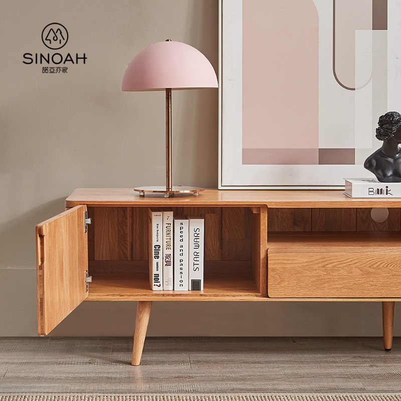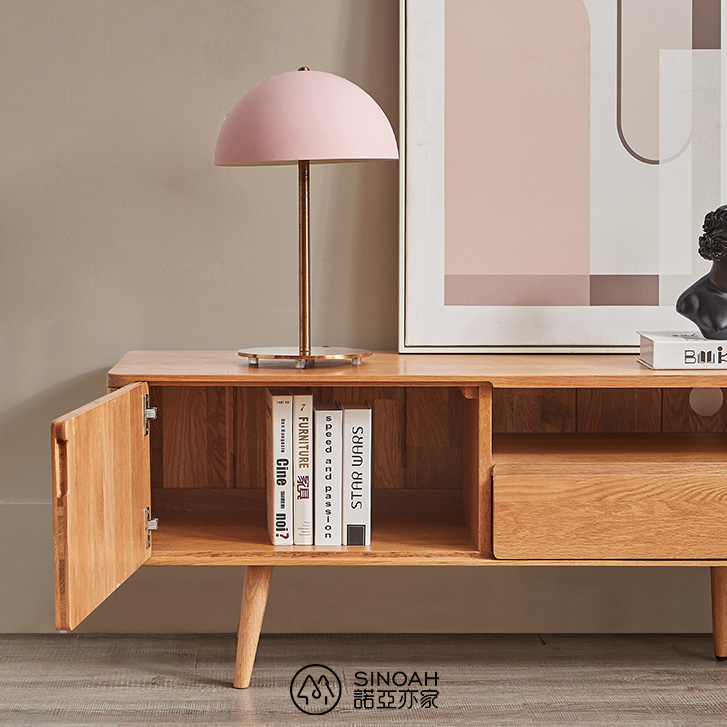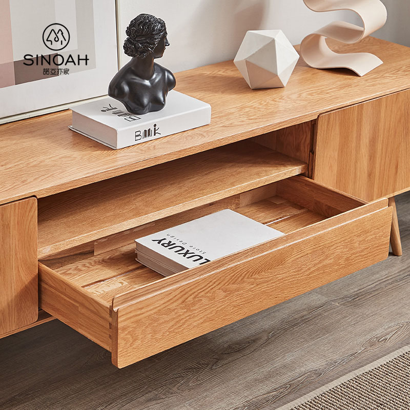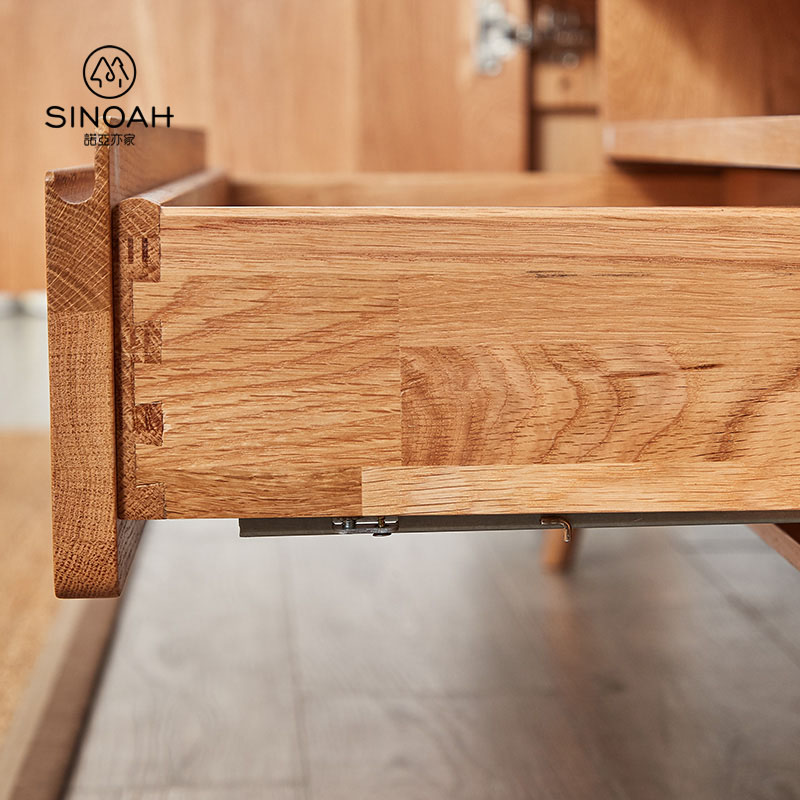 Den miljövänliga öppna färgen håller den verkliga strukturen av vit ek väl. Du kan uppleva friskheten och öppenheten i naturen hemma. Samtidigt har vit ek en stark bärförmåga. Även om designen på linjerna är enkel är funktionerna väldigt praktiska och storleken lång. Förvaringsutrymmet kan rymma mat med olika specifikationer och tillgodose livets alla behov. Den öppna förvaringen kan inte bara lagra saker, utan också dekorera livet. Med flera lådor kan diverse saker finnas i den, vilket gör hemmet renare