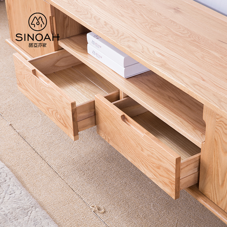 Sinoahär en professionell ledare China Nordic Oak Range Nice TV-skåp tillverkare med hög kvalitet och rimligt pris. Snyggt TV-skåp, ett enkelt och modernt TV-skåp i massivt trä, är tillverkat av vit ek, naturligt trä och miljöskyddsfärg, med vacker struktur, fin och slät struktur och stark lagringskapacitet. Träglidbana med unik design och tydliga utseendeegenskaper: bottenplattan är 20 mm mer än sidopanelen