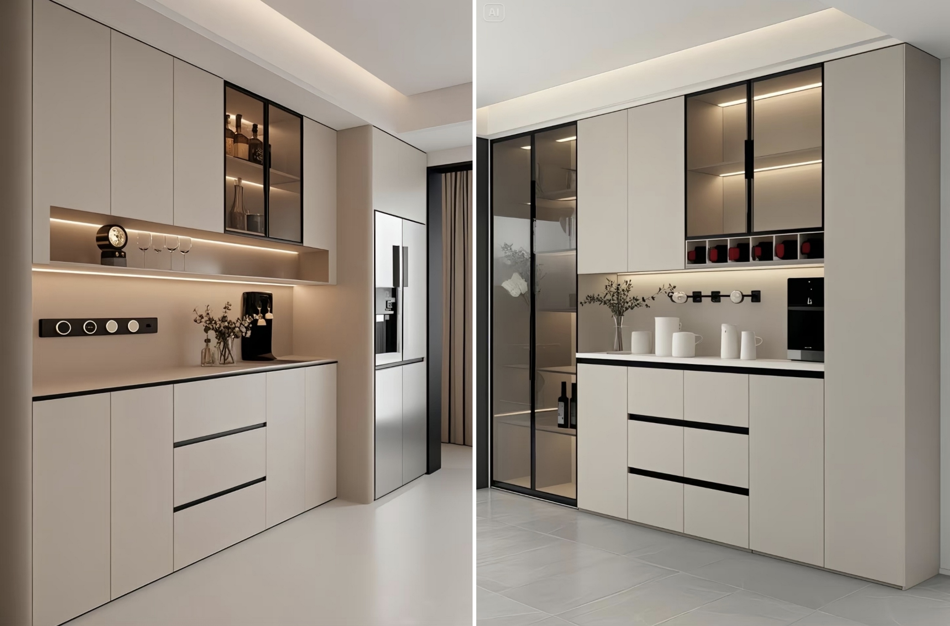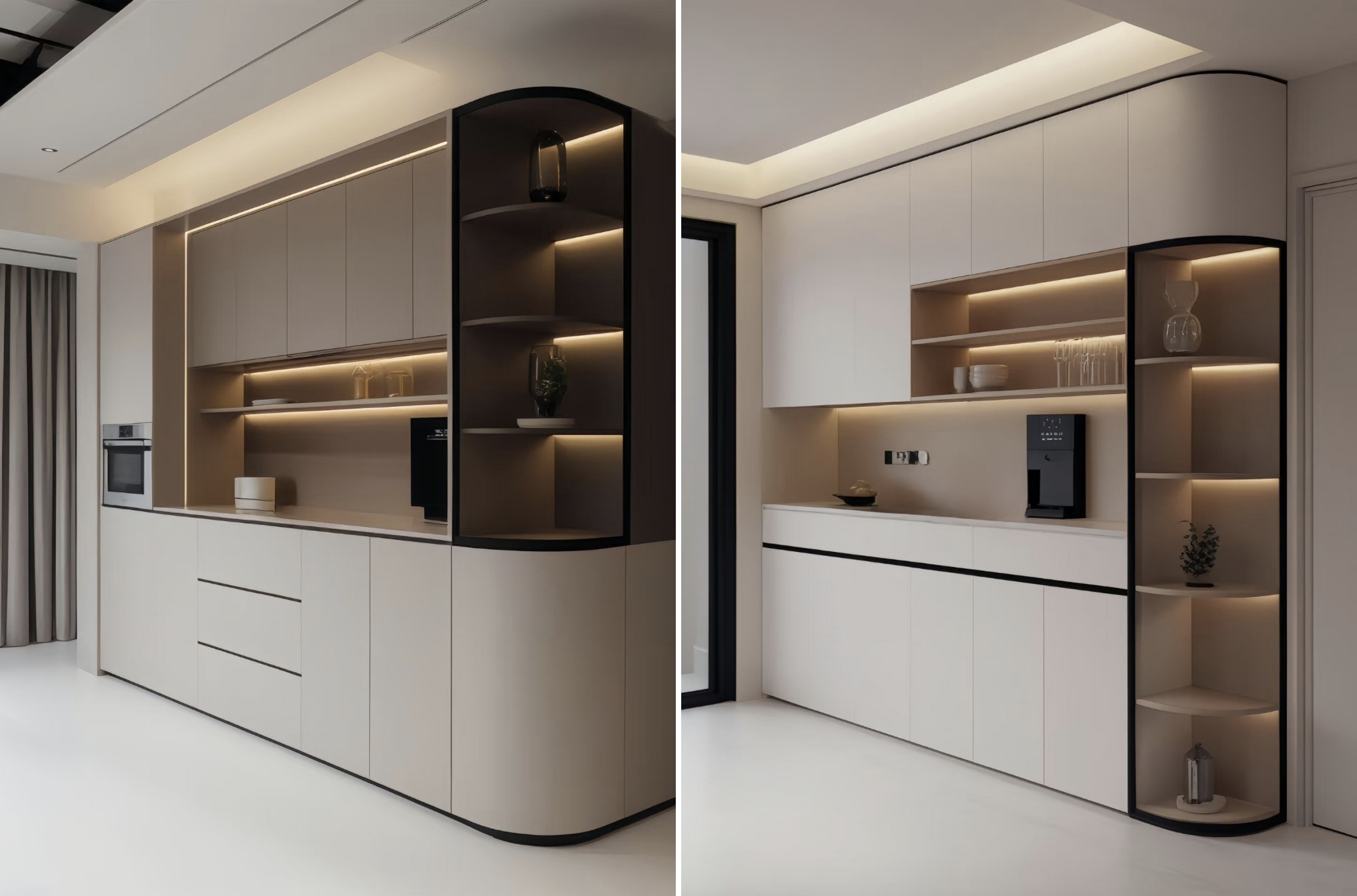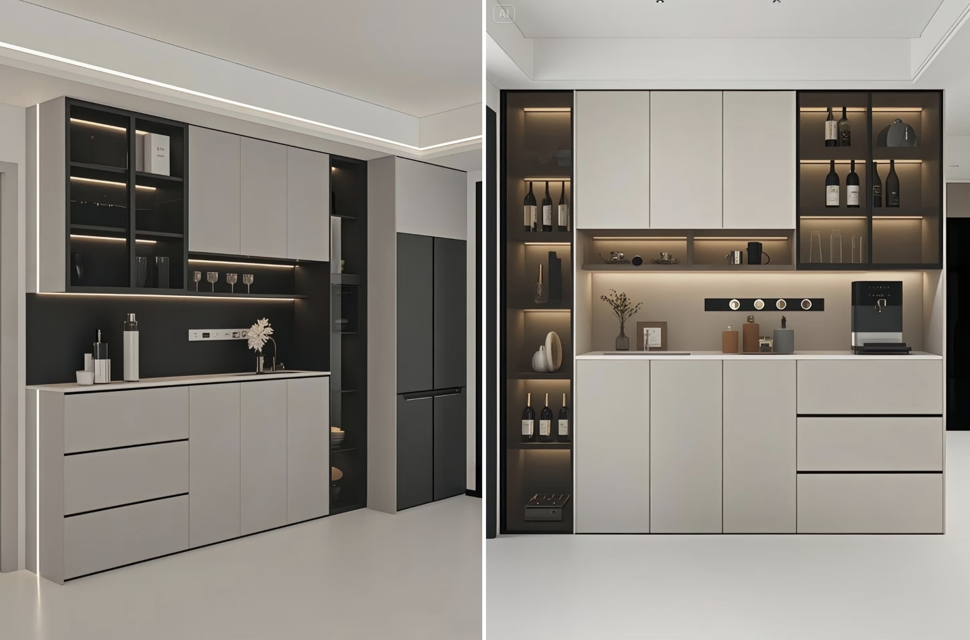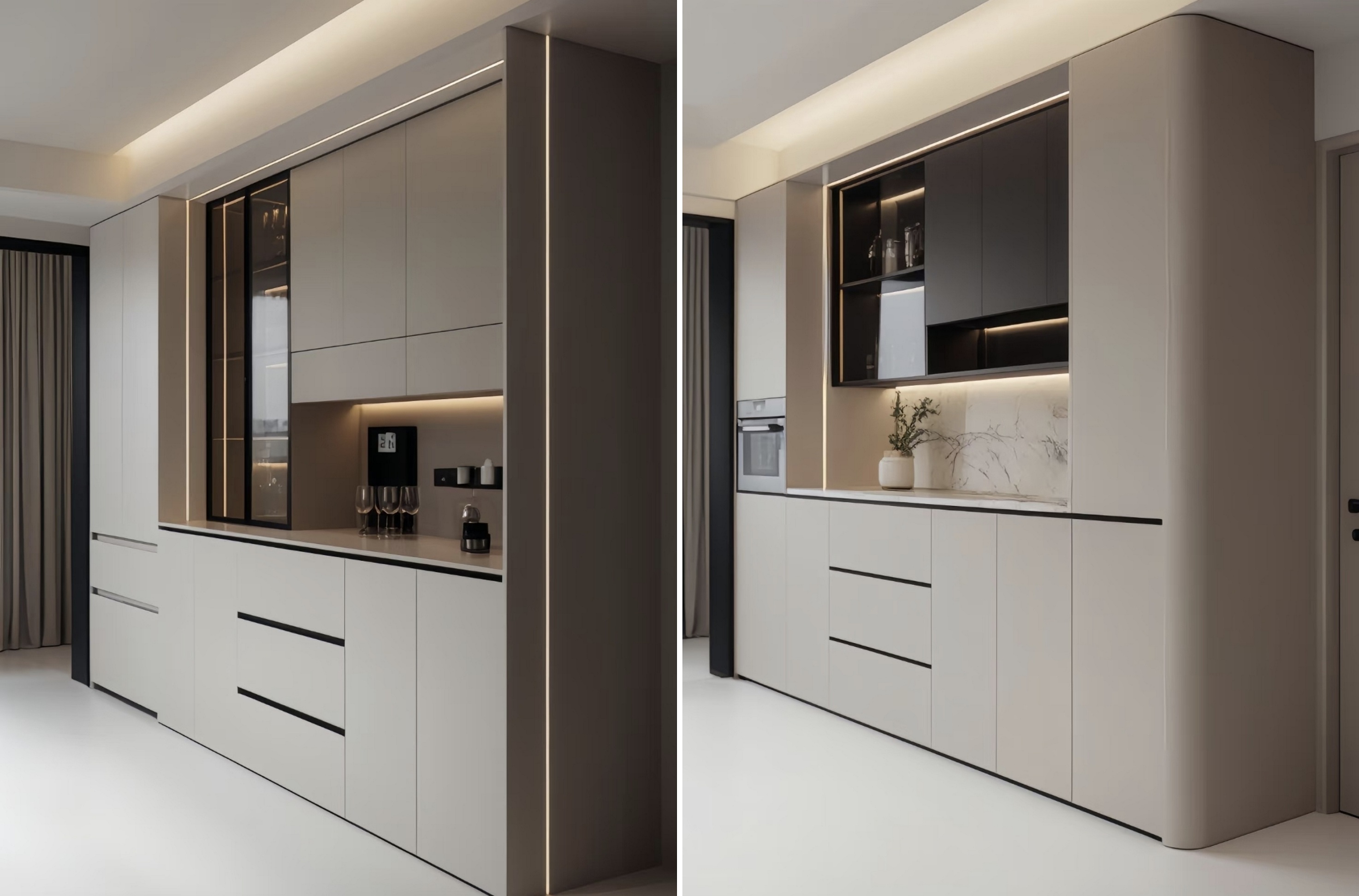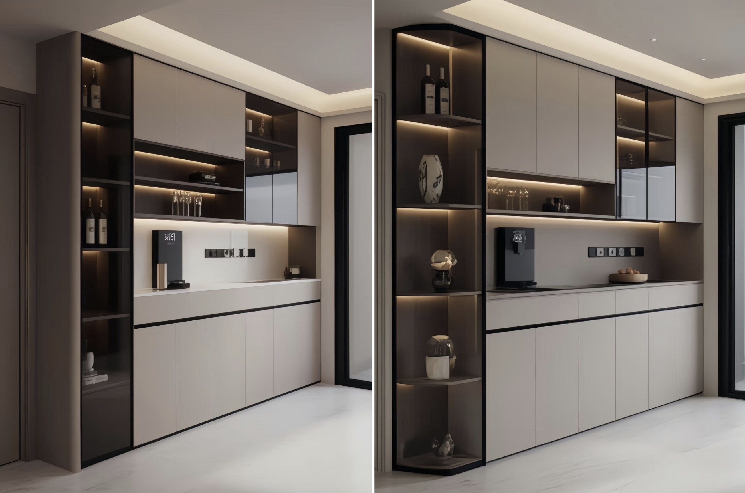 Genom att kombinera slutna skåp med öppna hyllor ger det gott om utrymme för förvaring av bordsartiklar, vin och små apparater. De öppna områdena kan också visa dekorativa föremål och lägga till en livslängd i rymden.